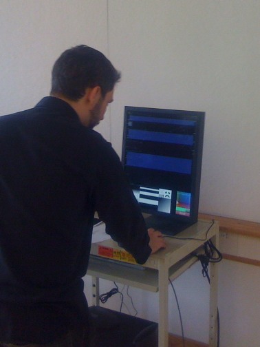 The synth was shown as an interactive toy. The display is a standard LCD rotated to landscape orientation. Audio is provided by a set of standard desktop computer speakers (with decent bass response). The software is running on a MacBook Pro which is stashed out of sight. Interaction is handled with just a mouse.
