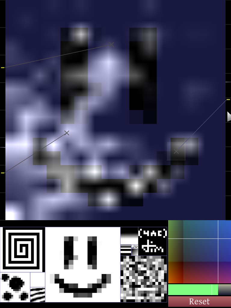 The program during normal operation. The upper area is the plate itself, with the current density visualized in blue and current vibration in white. The X's are sequenced plate strikes.