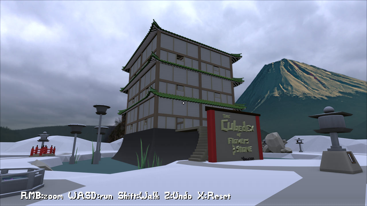 A cube-shaped Japanese-style castle and grounds. Includes eight obvious (and not-so-obvious) puzzles, including several variations of a few of them.