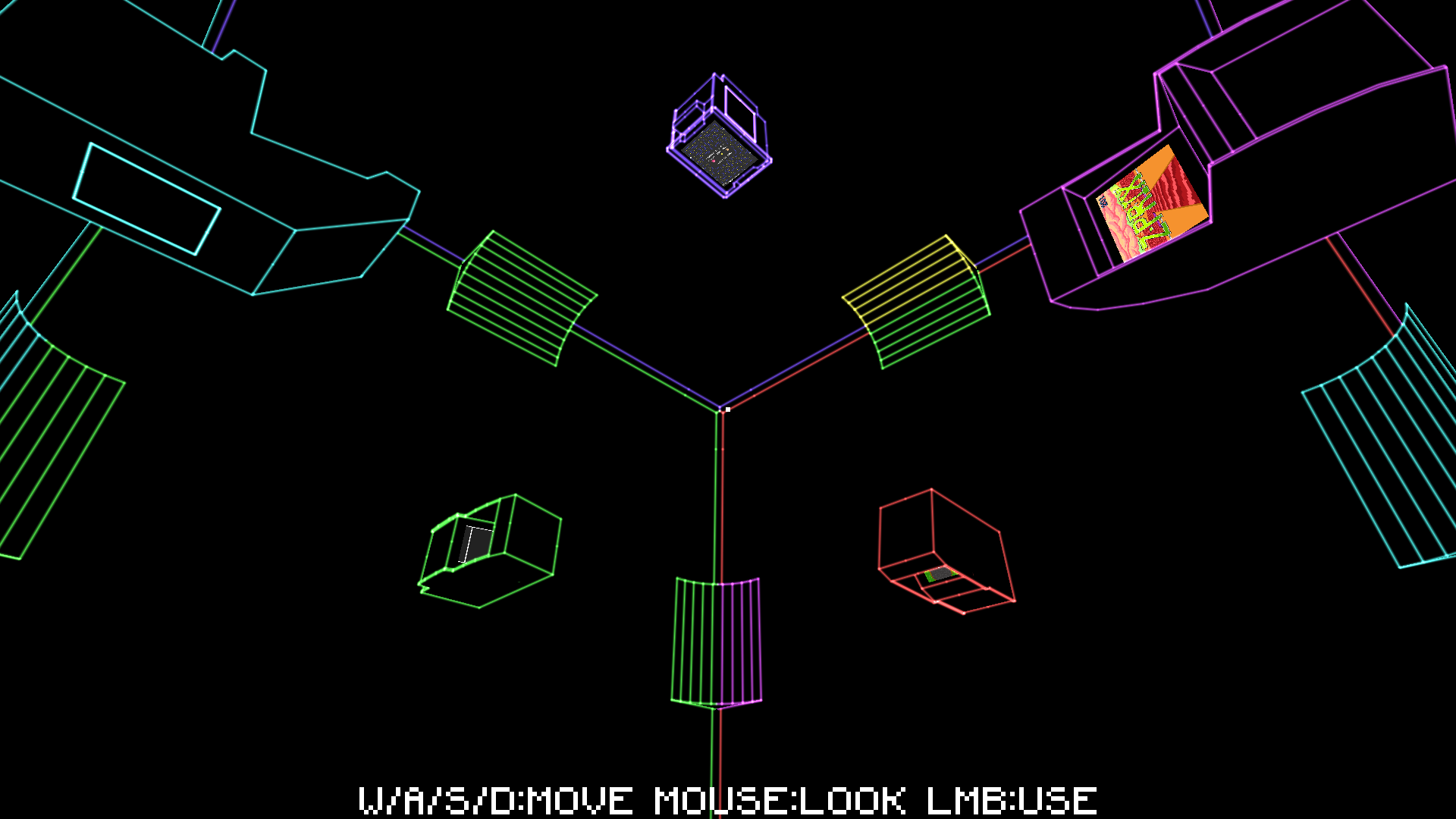 Seven puzzles pretending to be classic arcade games placed on the inside faces of a cubic arcade.