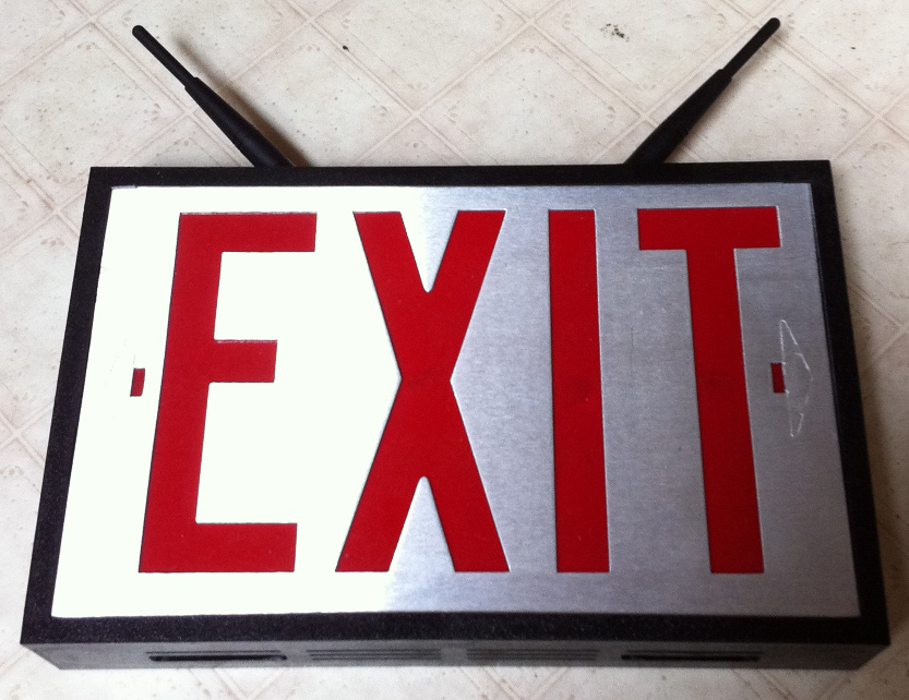 Despite the fact that I just threw this out, it is a favorite modification of mine. I like the incongruity of the antennae sticking out of the top of the sign. I also find it to be an appropriate case, as router is the exit of the network.