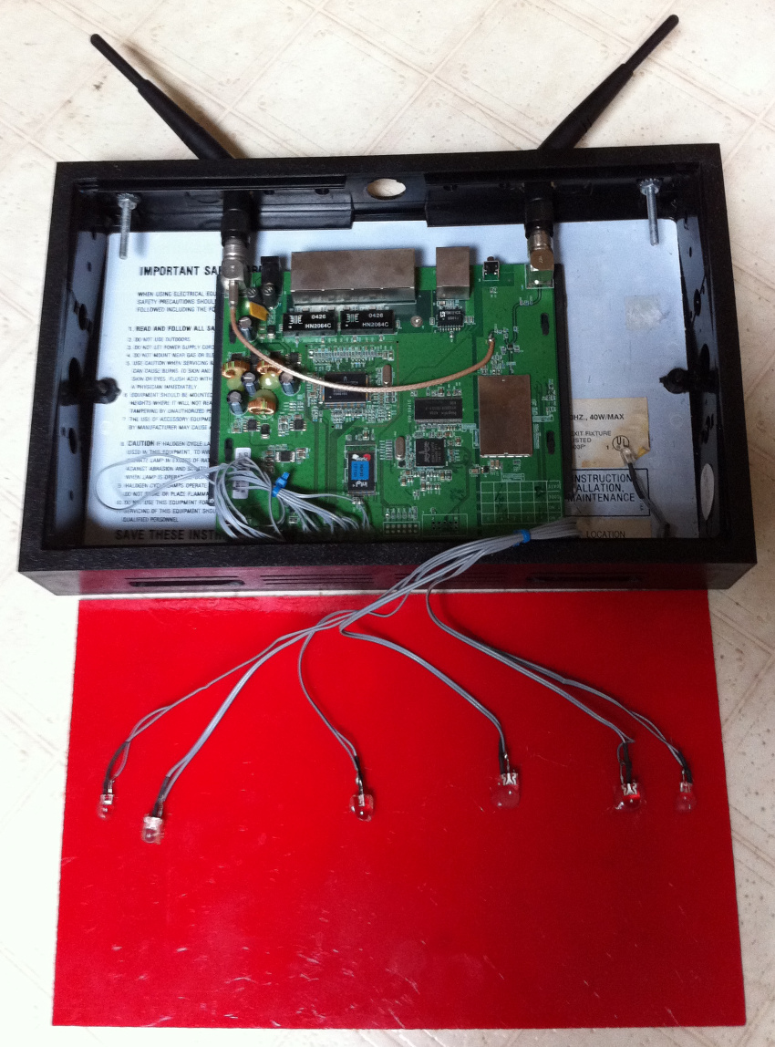 This recased WRT54G served as my router for a number of years. The status LEDs for each connection were brought out to the letters. However, when I moved to Somerville, I switched to a router with gigabit ethernet and faster wireless.