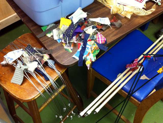 Each component was tagged with a cloth scrap, and bundles of cloth scraps were tied to the trees. Mike interpreted the clearing to assemble the structure: